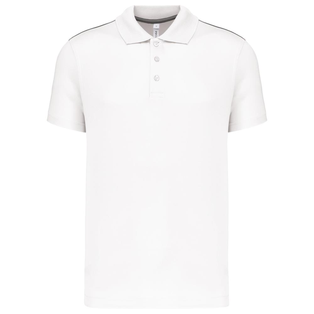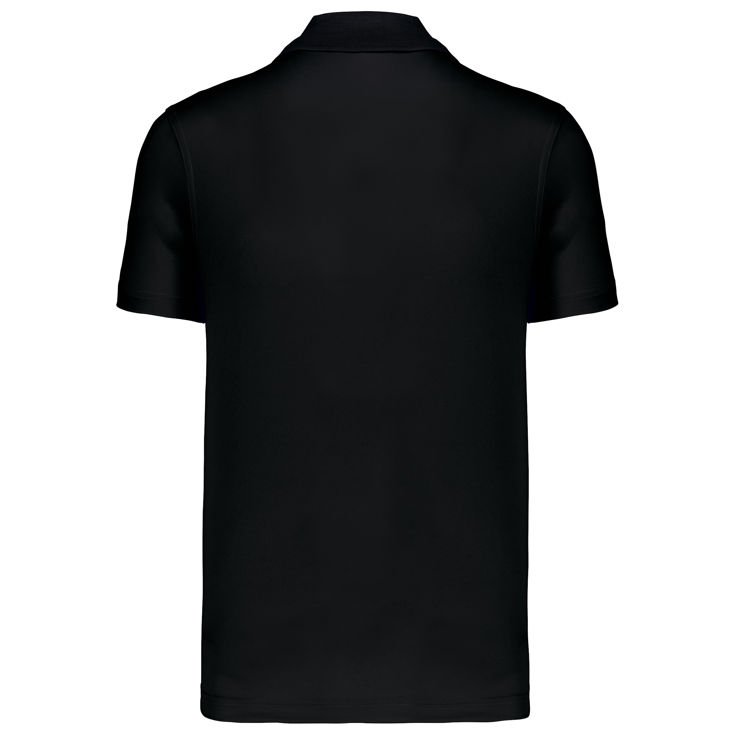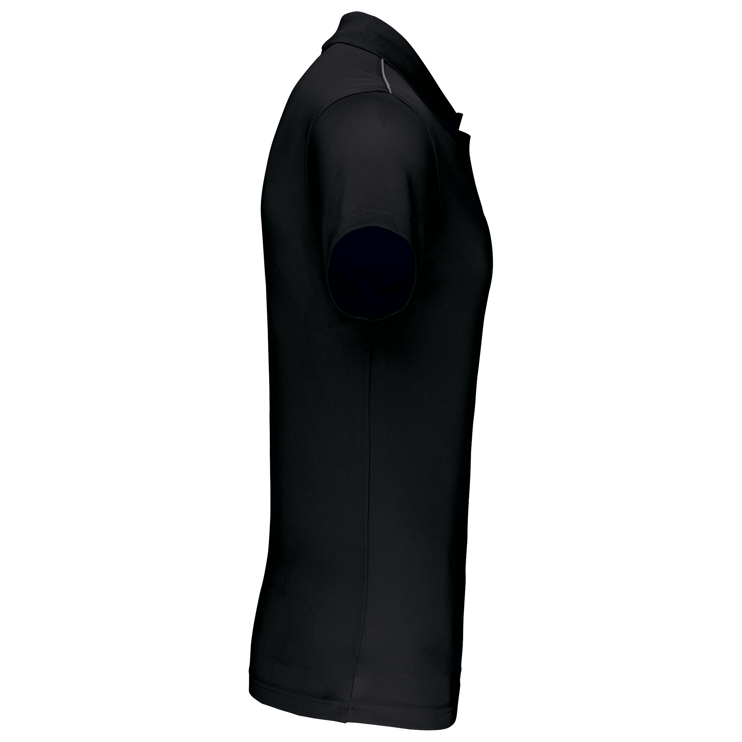 100% polyester interlock. Sneldrogende stof. Kraag in rib. Knooplijst met 3 knopen. Nektape en zijsplitjes in contrastkleur. Contrastkleurige bies op de schouders. Afwerking met dubbele stiksels aan de mouwuiteinden en onderaan. Gecertificeerd STANDARD 100 by OEKO-TEX®N° CQ1007/7, IFTH.