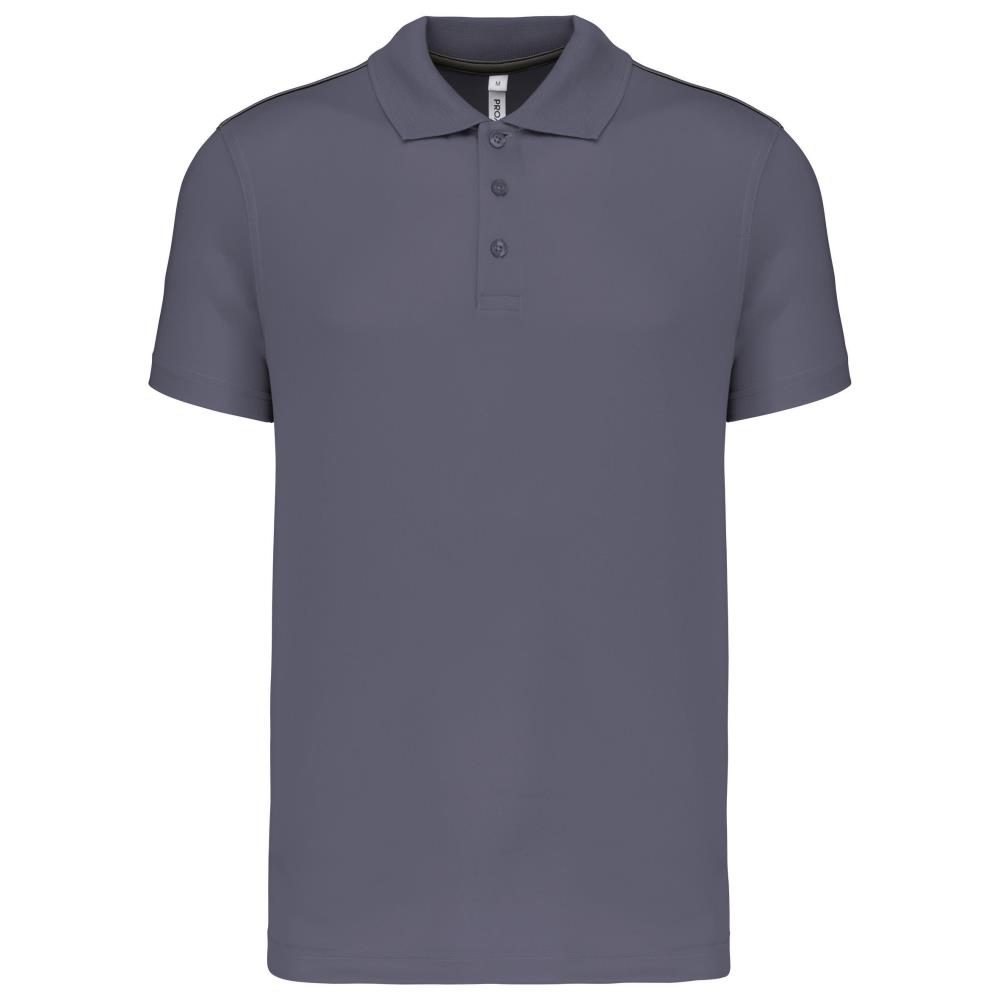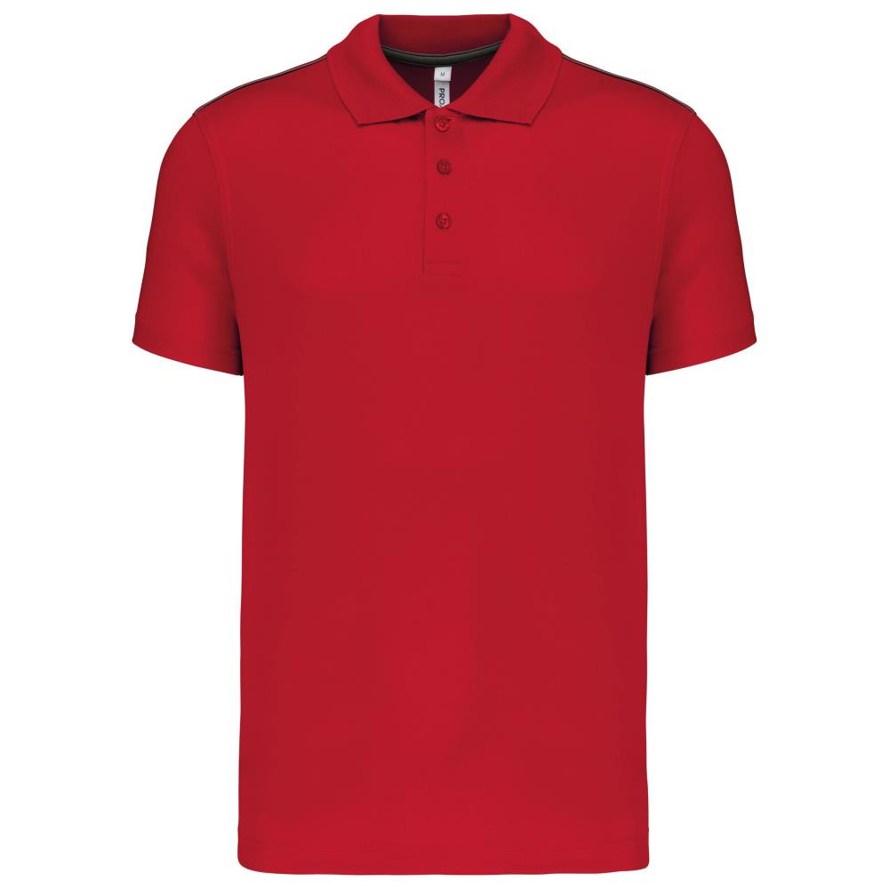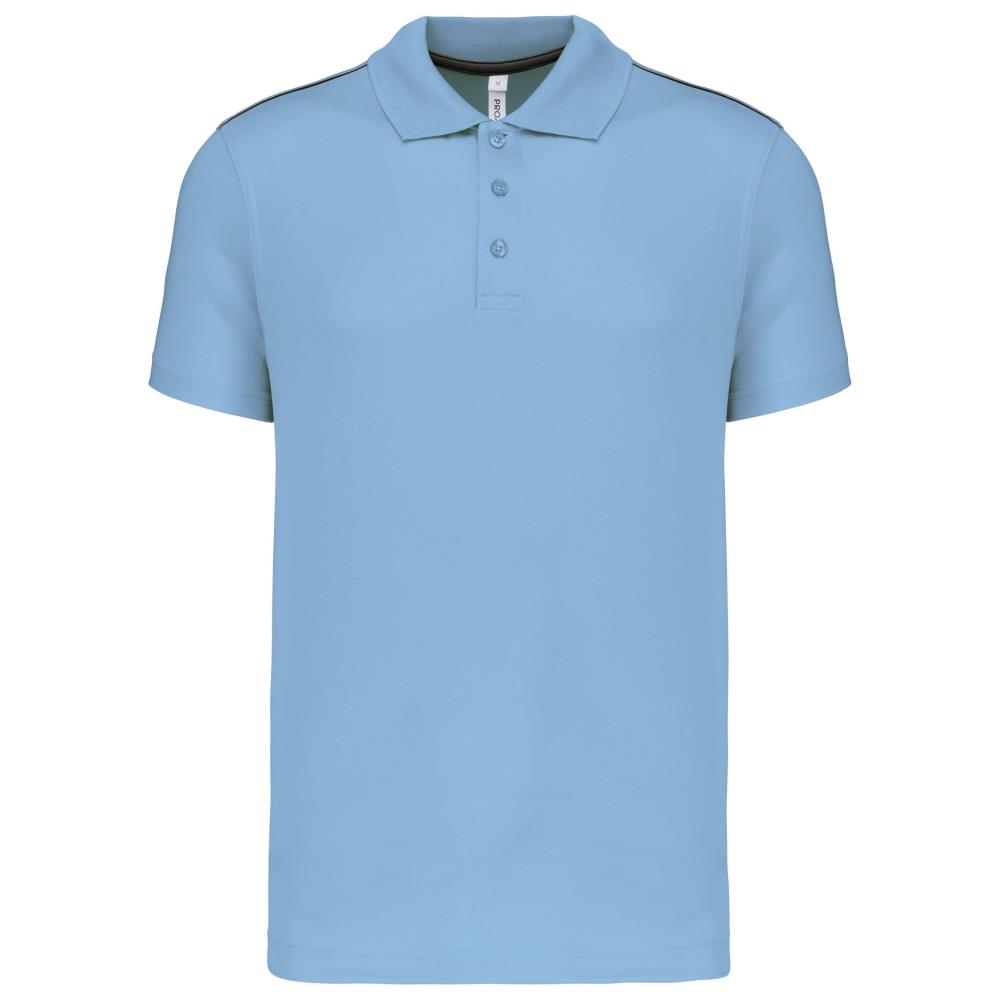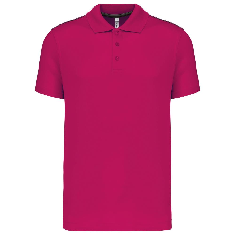100% polyester interlock. Sneldrogende stof. Kraag in rib. Knooplijst met 3 knopen. Nektape en zijsplitjes in contrastkleur. Contrastkleurige bies op de schouders. Afwerking met dubbele stiksels aan de mouwuiteinden en onderaan. Gecertificeerd STANDARD 100 by OEKO-TEX®N° CQ1007/7, IFTH.