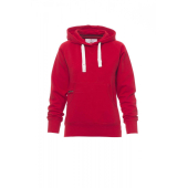Nauwsluitende dameshoodie met dubbel gestikte naden en wit trekkoord met contrasterend stiksel en metalen ringen, raglanmouwen, V-stiksel bij de hals, kangoeroezakken, kleine zak met rits, ribboorden met stretch aan de zoom en mouwen, versterkte naden.