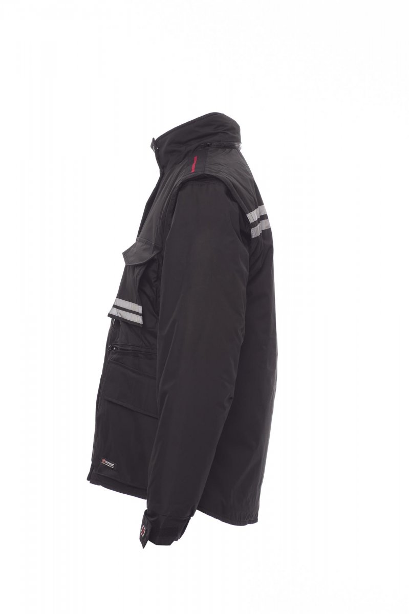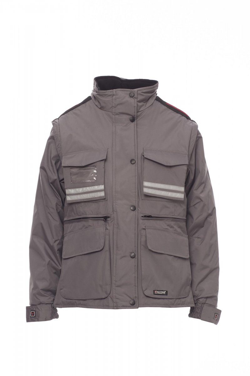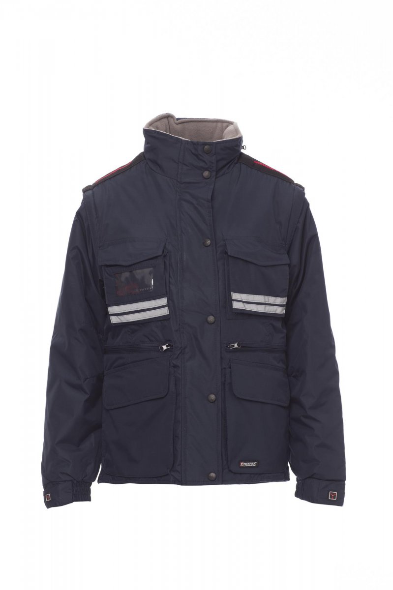 Damesjas met afneembare mouwen, comfort-fit, kunststof rits van 8 mm met metalen runner met overslag en kunststof knopen, afneembare en/of uitvouwbare gevormde capuchon, verstelbare manchetten, grijze reflecterende banden aan de voor- en achterkant, voorgevormde ellebogen en zijsplit met inzetstuk en rits, negen buitenzakken waarvan twee met LOCK SYSTEM, twee met rits en verstevigde binnenzak, een met omkeerbare badgehouder. Binnenzijde: gewatteerd, binnenkraag, rug en onderrugverwarmer van microfleece, ademende inzetstukken onder de arm, trekkoord in de taille en rits aan binnenkant voor eenvoudiger bedrukken en borduren.