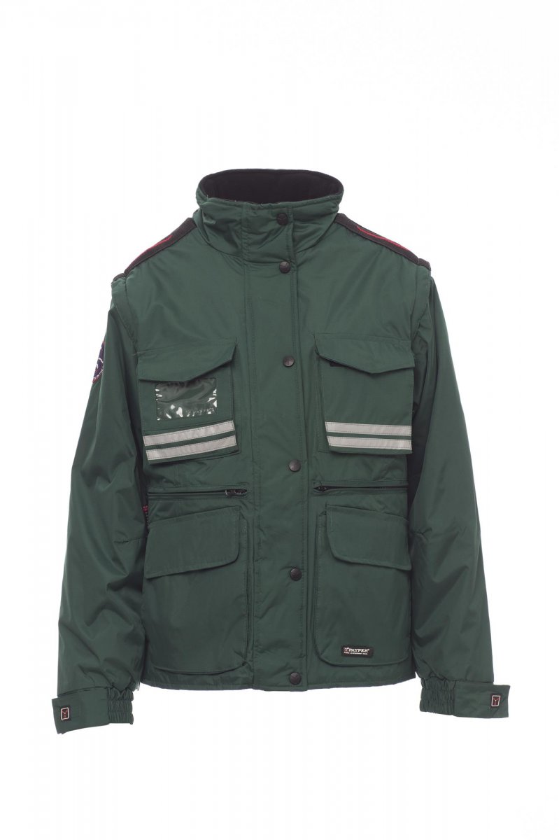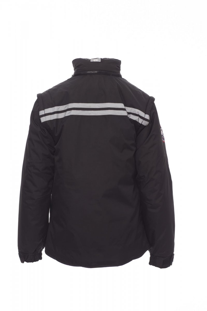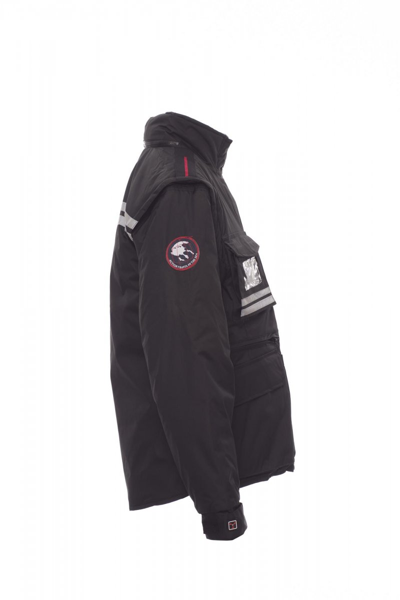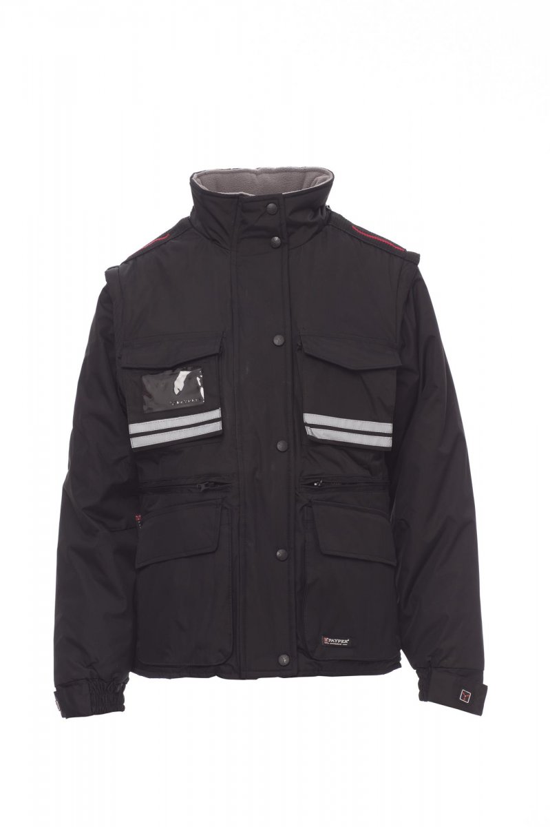 Damesjas met afneembare mouwen, comfort-fit, kunststof rits van 8 mm met metalen runner met overslag en kunststof knopen, afneembare en/of uitvouwbare gevormde capuchon, verstelbare manchetten, grijze reflecterende banden aan de voor- en achterkant, voorgevormde ellebogen en zijsplit met inzetstuk en rits, negen buitenzakken waarvan twee met LOCK SYSTEM, twee met rits en verstevigde binnenzak, een met omkeerbare badgehouder. Binnenzijde: gewatteerd, binnenkraag, rug en onderrugverwarmer van microfleece, ademende inzetstukken onder de arm, trekkoord in de taille en rits aan binnenkant voor eenvoudiger bedrukken en borduren.