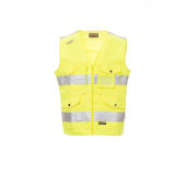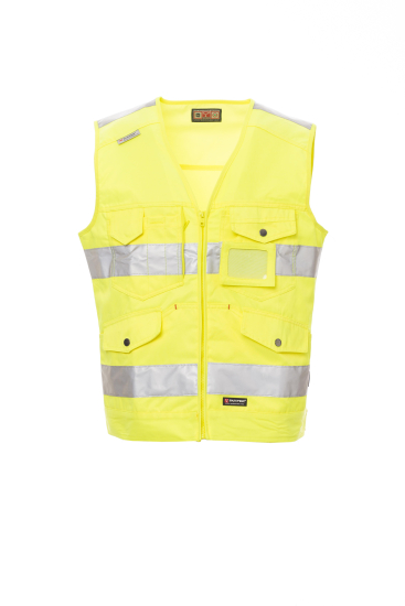 Bodywarmer met hoge zichtbaarheid met 3M strepen, voorsluiting met afgedekte rits, verstelbare tailleband met knopen, twee kangoeroezakken voor met LOCK SYSTEM en met metalen knoop, twee multifunctionele borstzakken, afneembare, uitvouwbare badgehouder. Nauwsluitend model in jeansstijl.