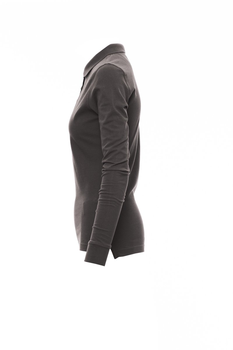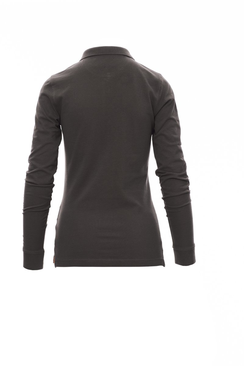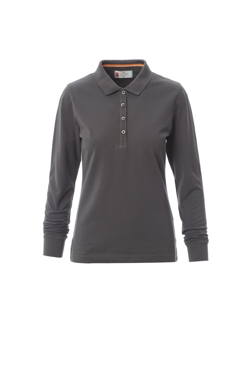 Nauwsluitend damespoloshirt met lange mouwen met 4 bijpassende knopen met parelmoereffect, ribkraag en ribboorden aan de mouwen, zijsplitten, verborgen stiksels bij de kraag met contrasterende band, elastische naden, versterkingsband aan de zijkant, band aan de binnenkant van de nek.