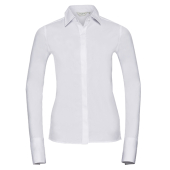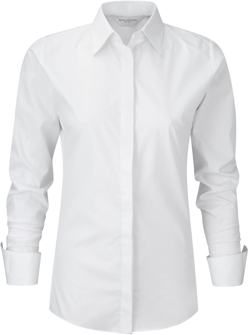 Shirt LSL. 75% katoen-25% Lycra® (T400® fibre). Gewicht: wit 125 g/m², zwart 130 g/m². Stretch. Uitstekende vormvastheid, duurzame stof, vochtregulerend, dit houdt de drager droog en koel. Moderne kraag. Verborgen knoopsluiting. Princess panel seams, geen zijnaden. cocktail manchetten. Ronde zoom.